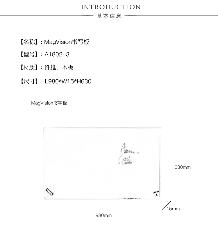 MagVision是一款高品质的移动白板,具有磁性E3-珐琅表面(NCS S 1002 G50Y),带有银色或白色阳极氧化铝框架和圆角塑料。有不同尺寸可供选择。背面覆盖有厚度为0.3毫米的铝板。白板有一个隐藏的悬挂,也有一个带轮子的支架,因此它是移动的。