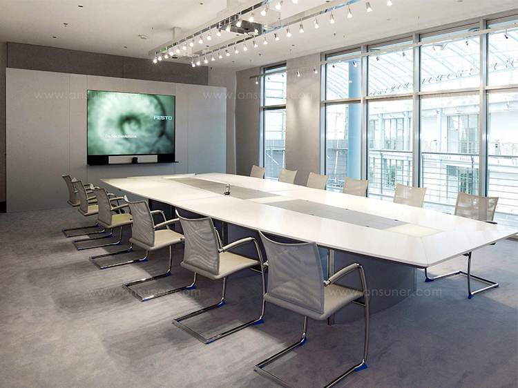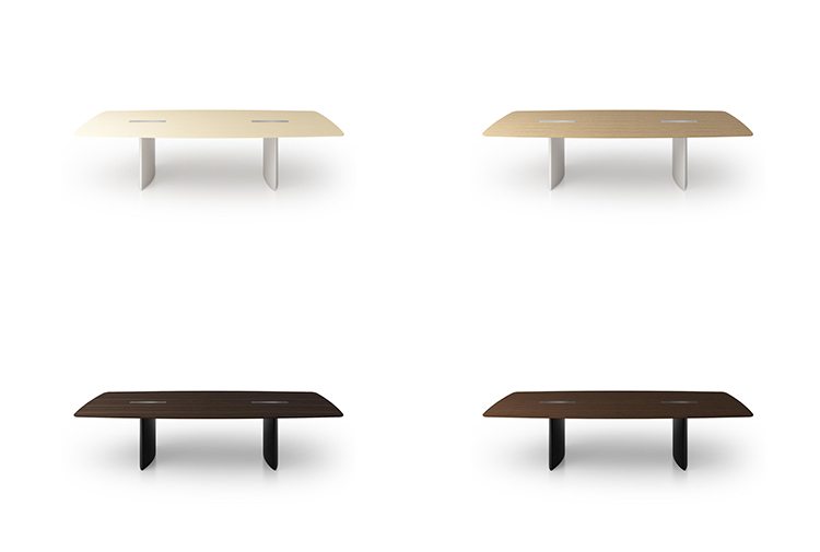 船形或椭圆形为基本形状的高级会议桌。优雅的外形之下,椭圆形、直线形桌腿或整体的桌下机构,可完美收纳走线及隐蔽多媒体设备。中央多媒体槽完美的整合了投影设备和多媒体接口。表面材料可选白色特殊树脂,实木贴面,烤漆和层压板。
