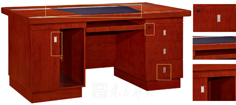 ※  上图将此款职员台精湛的细节部位另行罗列,例如隐藏式铝合金拉手,按下拉出,实木的收纳式键盘架,镶嵌式梯形皮垫,做工的精细更加突出班台的庄重与典雅,体现出使用者的沉稳和细腻!