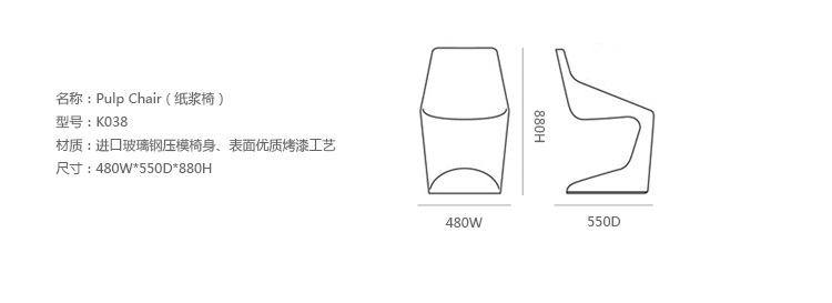 纸浆椅(Pulp Chair)是设计师Christophe Pillet(克力斯托夫·皮列特)设计经典作品。为符合 品牌Kristalia 科技、简约、符合人性的品牌形象,纸浆椅(Pulp Chair)以注模方式一体成型,现代感的简约线条中融入人体工学与结构力学,同时达到轻、可堆叠与户外使用的功能,在开发过程中极具挑战性法国设计师Christophe Pillet 毕业于法国尼斯艺术学院,并再获得意大利著名的米兰Domus 学院的硕士学位。曾与 Philippe Starck 在法国合作约 5.6 年的时间。之后他开始尝试多方面的设计领域,不论是建筑、室内设计或是他所专长的家具灯饰设计,都有相当亮眼的成果。收边处强化高低落差形象,呈现出宛如瓢子一般的造型,悬臂式的设计,让椅身保留些许弹性,可堆栈、可室外使用的设计巧思,让 Pulp Chair 成为简洁居家用椅的优质选择。