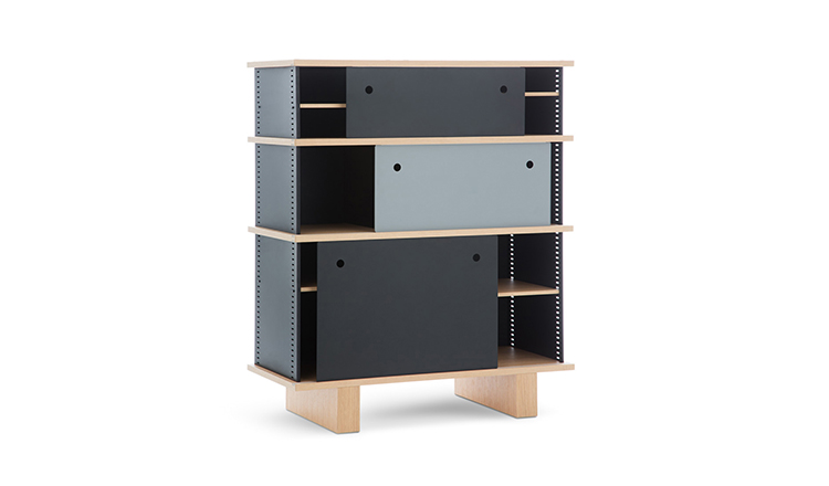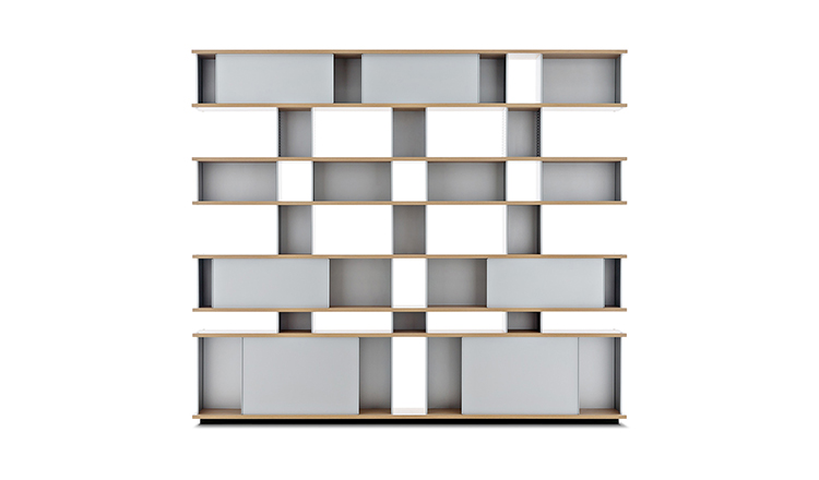 该系列包括餐边柜、碗柜和书架等,采用地面支撑或对称及非对称悬架,还包括与空间建筑风格相匹配的独立式书柜。基本单元组件为橡木搁架,阳极处理或黑色漆面的铝质单元。包括5种不同的高度,以实现物品和书籍不同风格的最佳布置。每种家具都配有附件,如铝盘等。书架滑轨采用阳极氧化铝、红色、蓝色、绿色、黄色、灰色、白色或黑色漆面。这款模块化书架由Charlotte Perriand设计,结构化处理运用巧能生精。对女设计师来说,每个模块结构并非一个单纯的块面,经过玩味地组合能有让人欣喜的效果。这件作品高度表现了Perriand在家具设计上的先锋精神,其对建筑艺术性、居住性,生活的信仰。