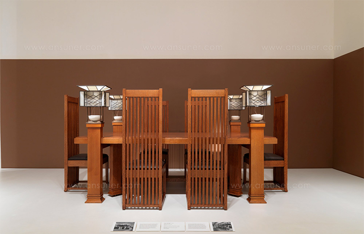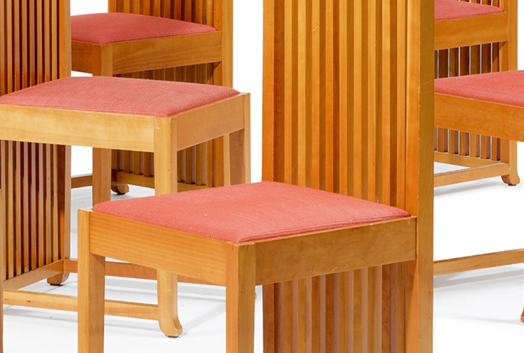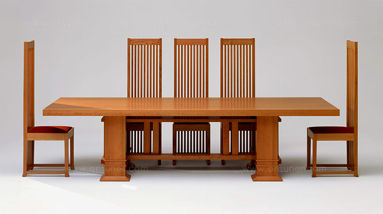 高背椅,采用天然樱桃木戒樱桃木色的胡桃木制造。座垫采用聚氨酯海绵填充。布艺面料戒皮革软包。