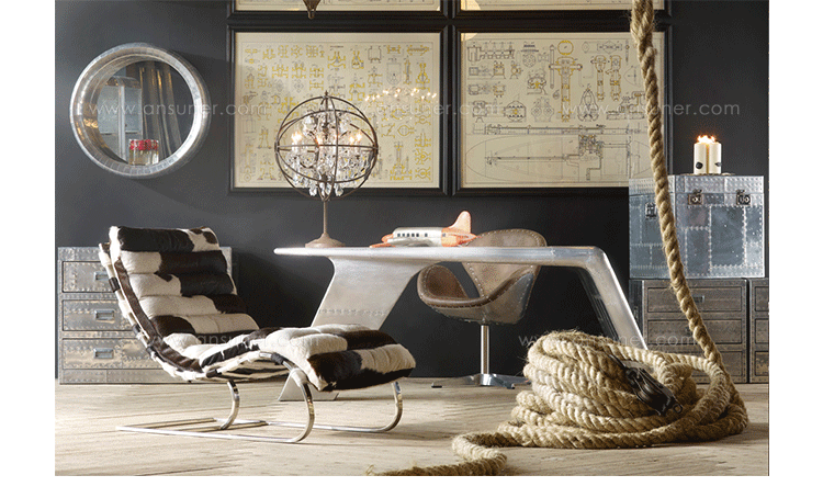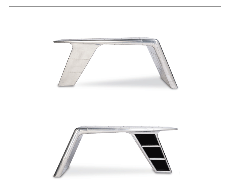 Aviator Valkyrie Desk(飞行员瓦尔基里台)由英国著名设计师Timothy Oulton设计,灵感来源于1960年北美航空的超音速轰砸飞机XB70,并以此命名。瓦尔基里台用铆接铝板制造,弧形线条符合空气动力学,有如一双机翼,通过手工艺进行打磨,进行磨光,座子整体造型有如喷火战机或黑色喷火式战斗机。