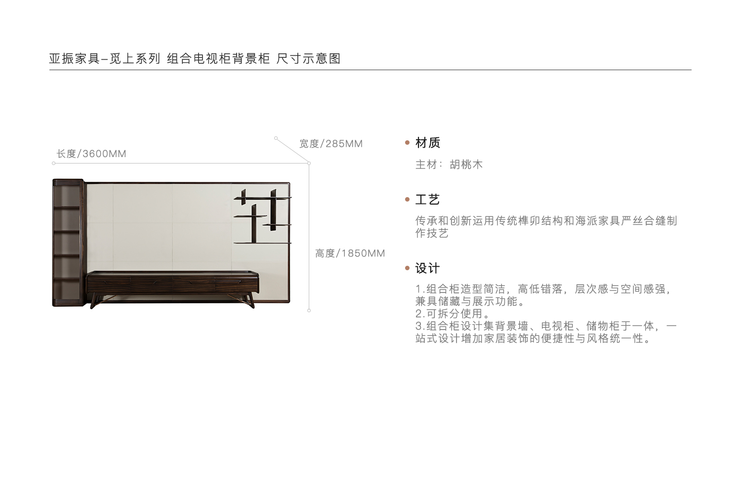 1.组合柜造型简洁,高低错落,层次感与空间感强,兼具储藏与展示功能。 2.可拆分使用。 3.组合柜设计集背景墙、电视柜、储物柜于一体,一站式设计增加家居装饰的便捷性与风格统一性。