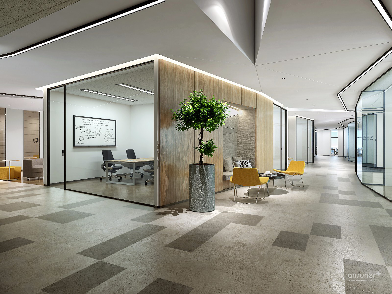 云行为不可见造成行为自由,而行为的自由却是由秩序来保证的,所以不可见的自由反而会以可见的秩序形成节奏,节奏形成美和品质。以可见的秩序与不可见的自由作为骨架,构建出的智慧空间,即拥有 “随处可以办公,随处不可办公”的独特特质。这种设计指导思路完全颠覆了传统办公空间的规则。
