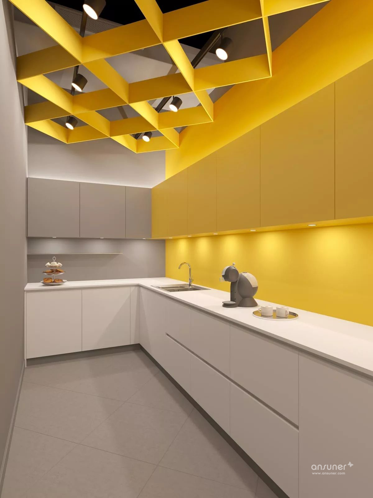 除了使用黑色,白色和灰色之外,设计师用鲜艳的色彩区调剂视觉,同时运用几何体细节,增添了趣味性。